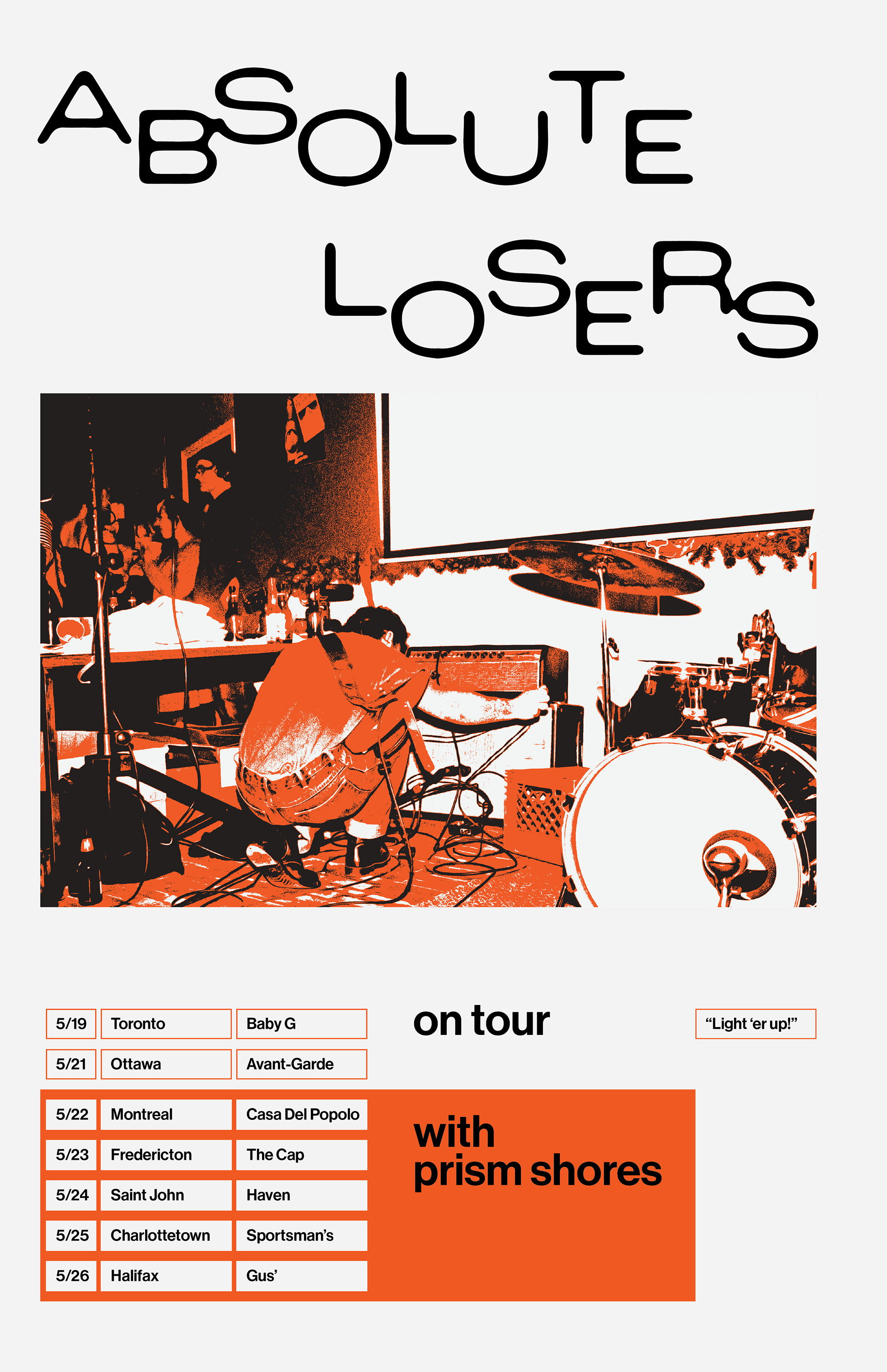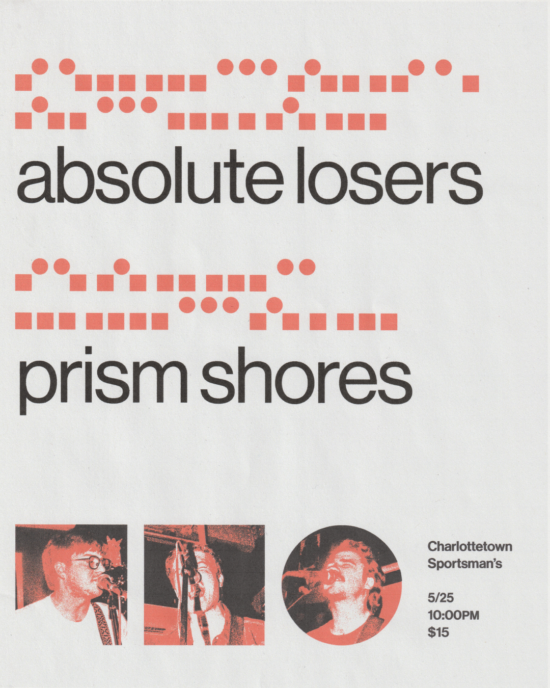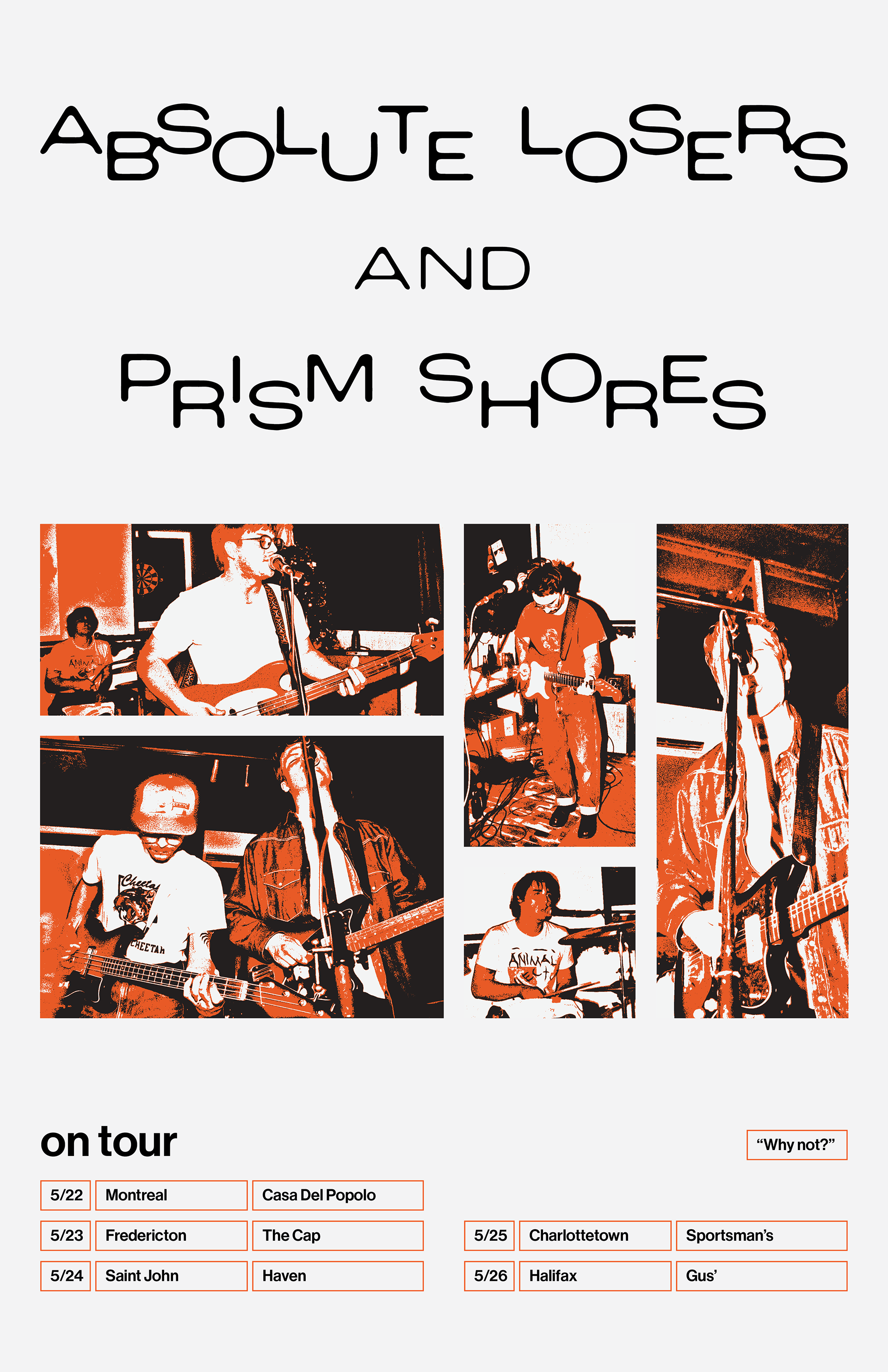 Tour poster designs for Absolute Losers (Charlottetown) with supporting band Prism Shores (Montreal).