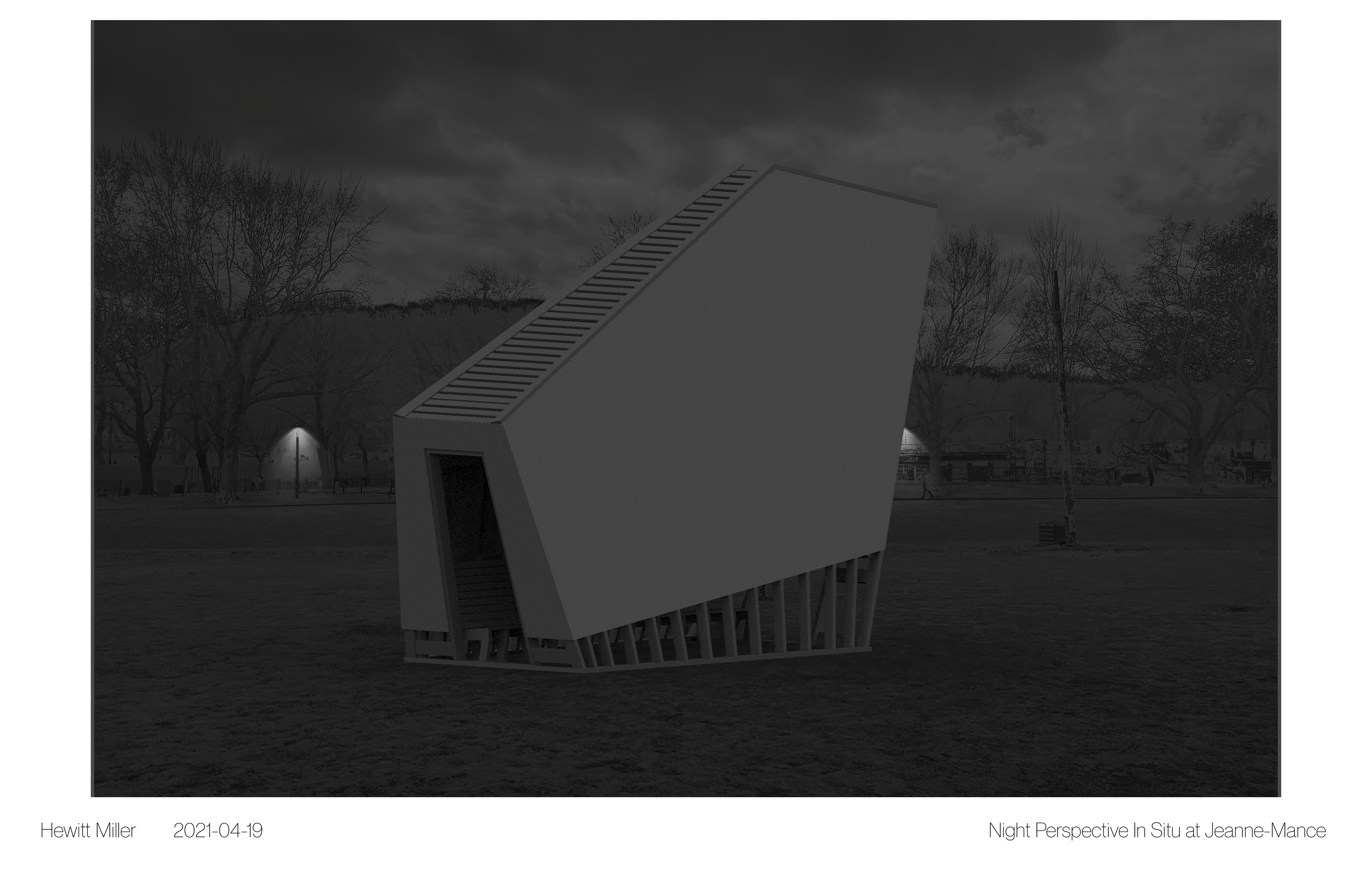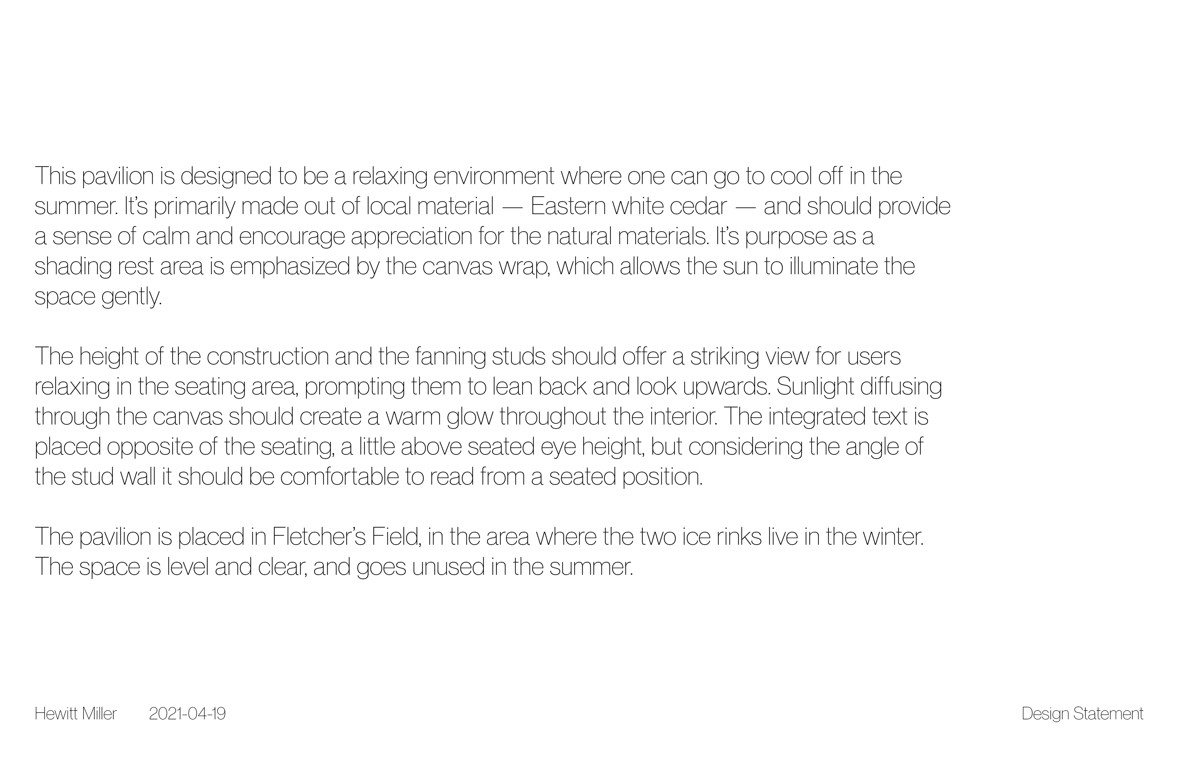 This installation project called for a pavilion with a focus on sustainability, with a maximum footprint of 150 square feet. For DART 335, Winter 2021.